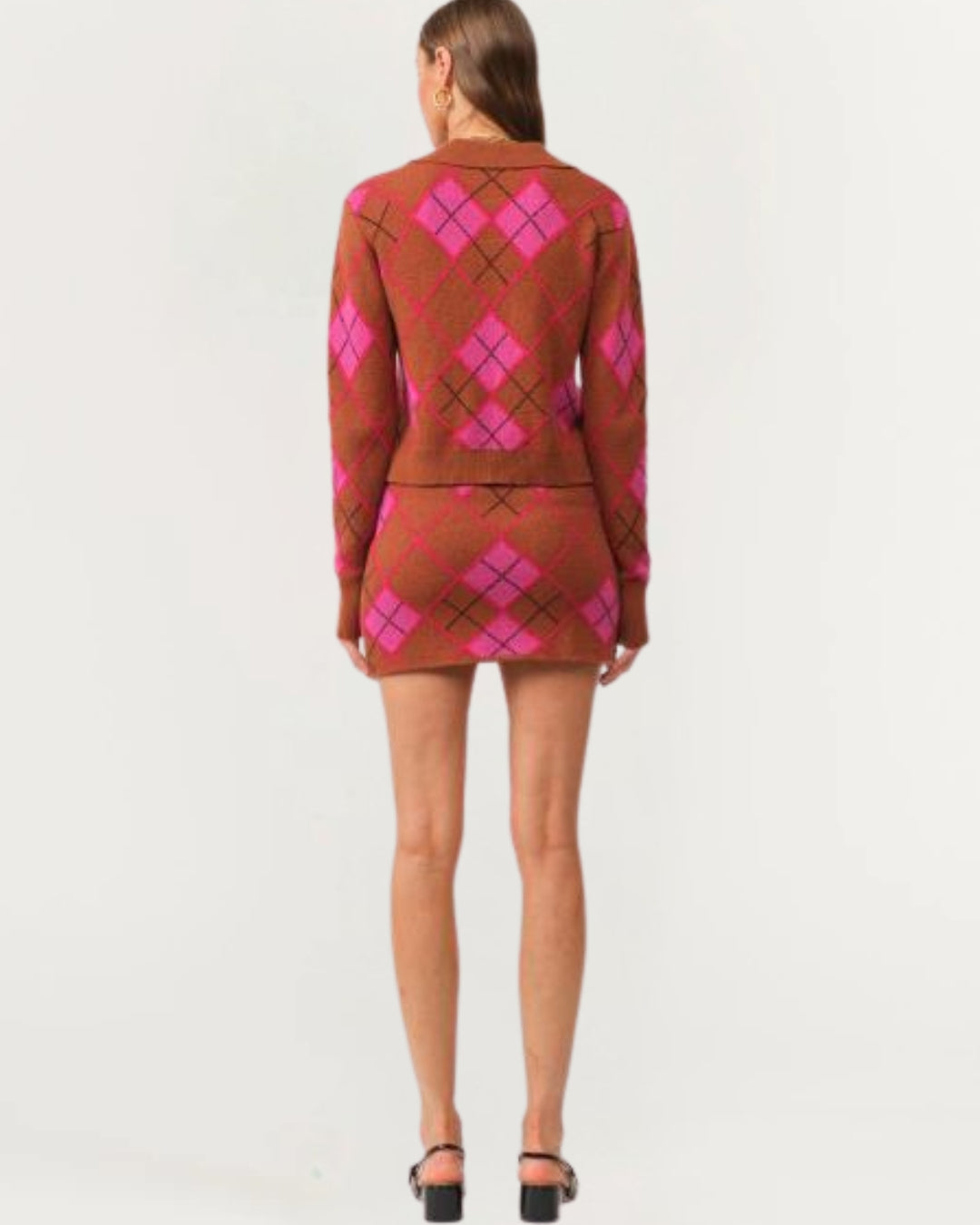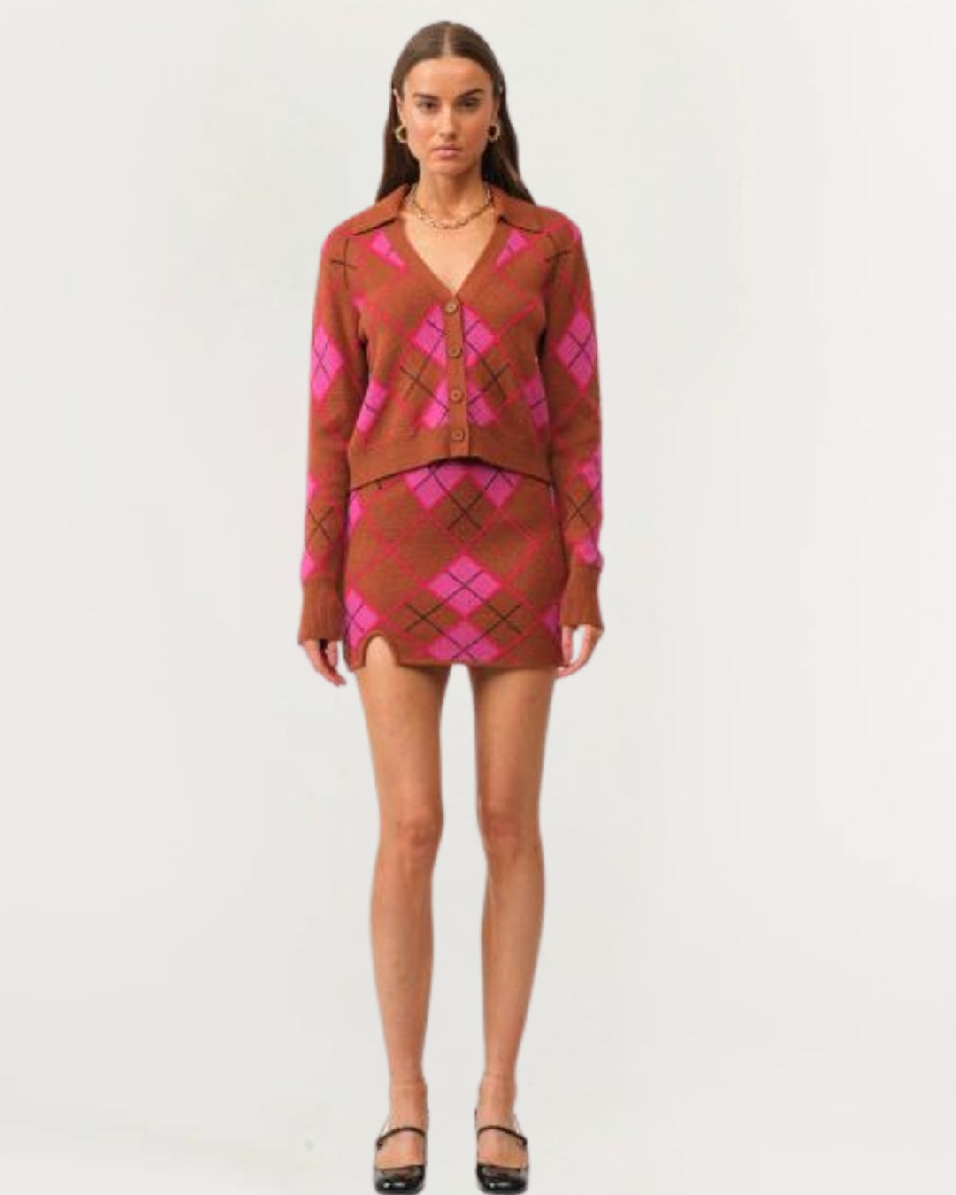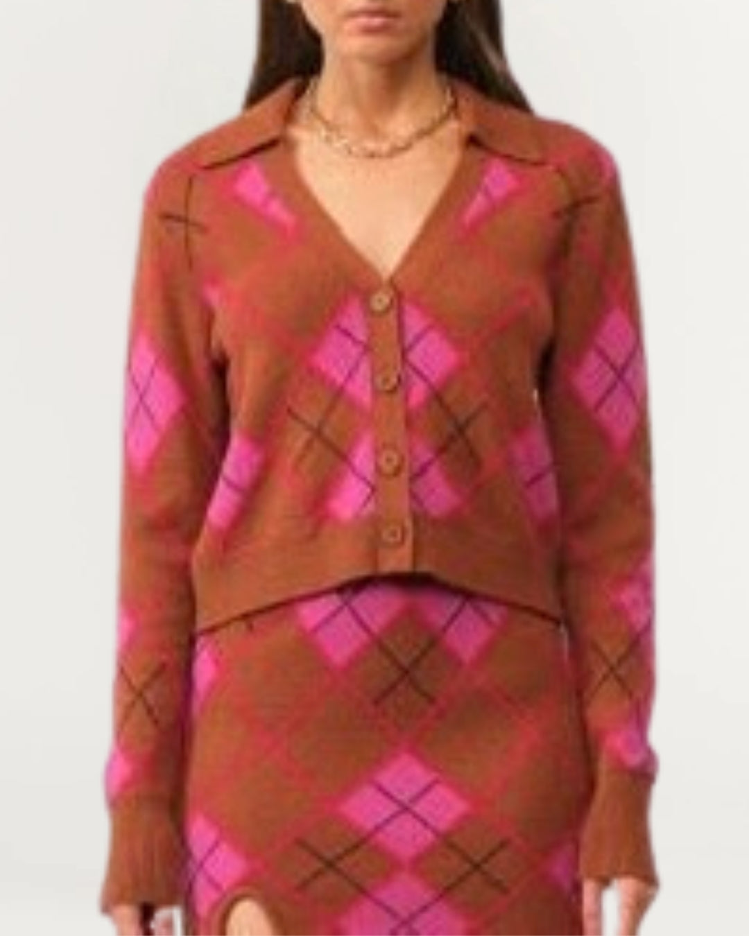 Style: Cropped argyle cardigan with a pointed collar and front button closure.