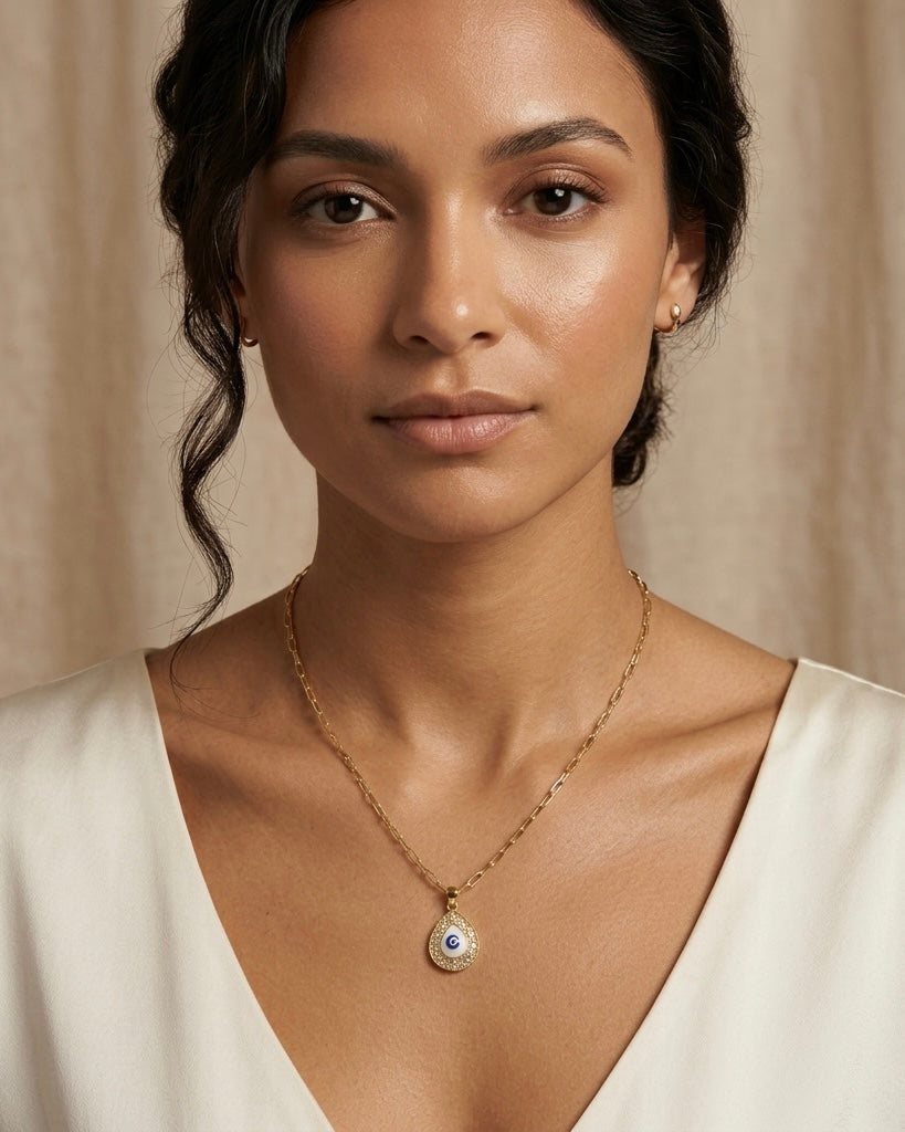 Details: Features a mother-of-pearl center with a blue enamel evil eye detail, surrounded by sparkling cubic zirconia stones. Includes an adjustable chain with a secure lobster clasp closure for a customizable fit.