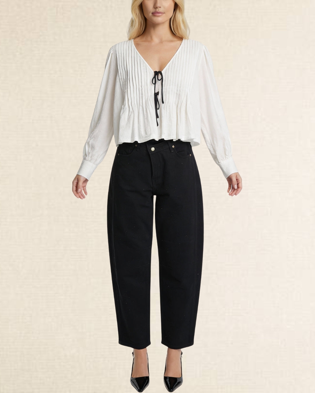 The Hannah blouse adds movement and delicacy through its pleated front and relaxed peplum shape, while the Janet jeans ground the look with a high-rise fit and subtle detailing. Styled together, they create an effortless contrast between romantic ease and contemporary tailoring.