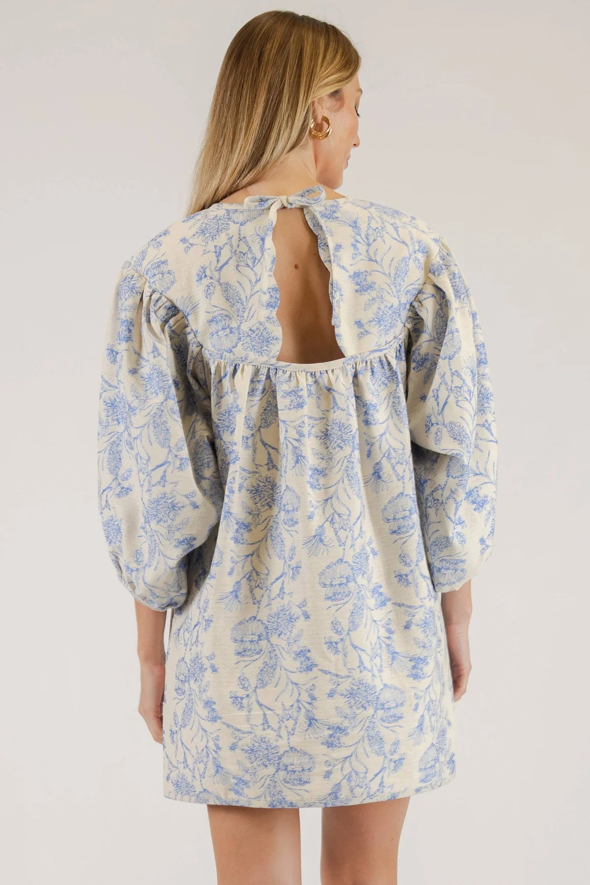 Color: Cream with blue floral print